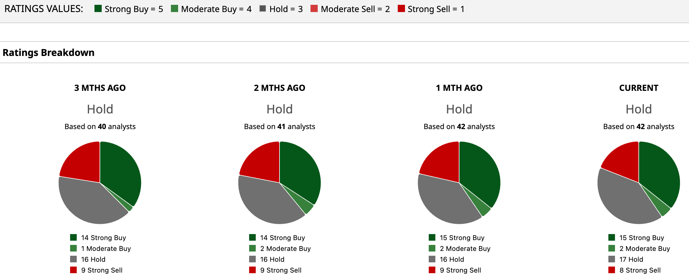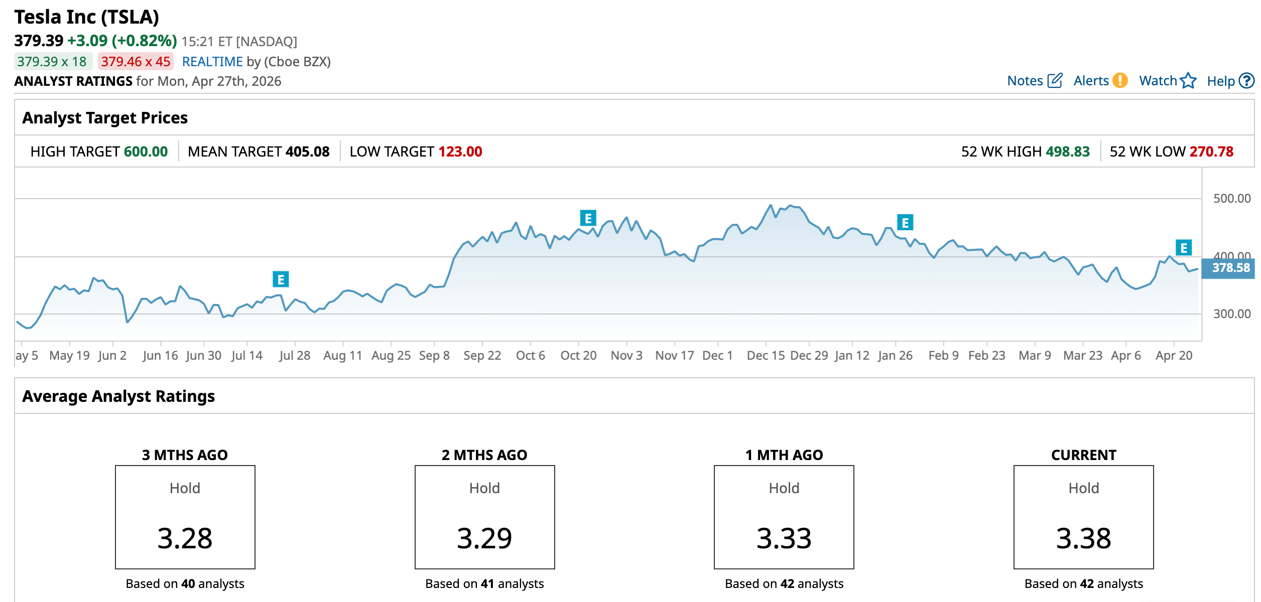 For Tesla, 42 analysts who were surveyed give a consensus rating of “Hold," with the mean price target is $405.08. That suggests just 6.77% upside from the current price.