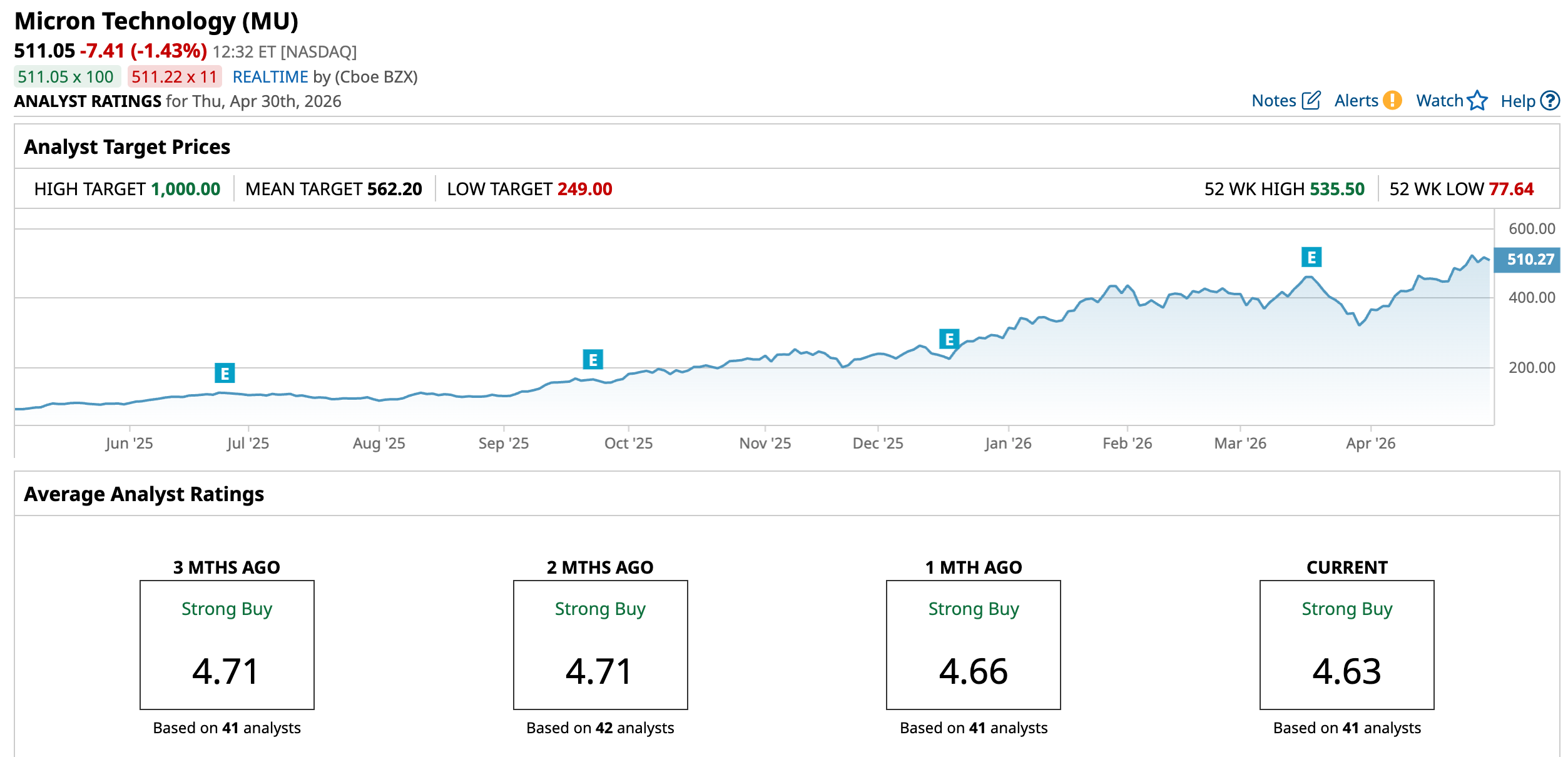 This momentum has extended into 2026, with the stock posting strong year-to-date (YTD) gains of 81.9%, supported by robust analyst upgrades and sustained investor enthusiasm around AI infrastructure spending. The rally culminated in a fresh 52-week high on April 27, when shares hit $531.36. Investors are increasingly pricing Micron as a structural AI winner rather than a traditional memory stock.