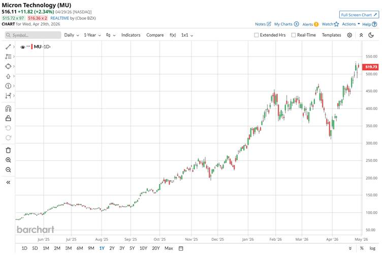 Shares of Micron Technology have delivered exceptional price performance, firmly establishing the stock as one of the top beneficiaries of the AI-driven semiconductor rally. Over the past 52 weeks, MU has surged 565.5%, driven by tight memory supply, accelerating demand for high-bandwidth memory, and a sharp recovery in pricing across DRAM and NAND markets.
