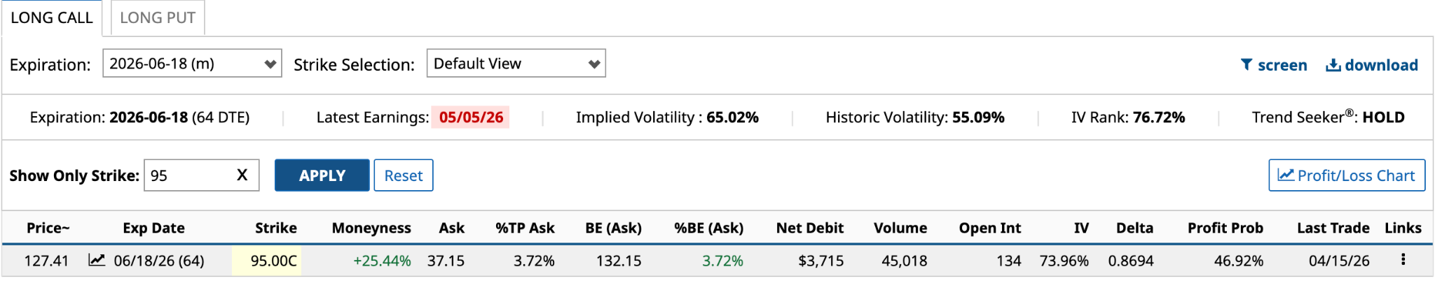 Deep ITM, the intrinsic value is $32.41 [$127.41 share price - $95 strike price], while the extrinsic or time value is $4.74 [$37.15 ask premium - $32.41 intrinsic value]. Your breakeven is $132.15, 3.72% higher than the $127.41 closing price.
