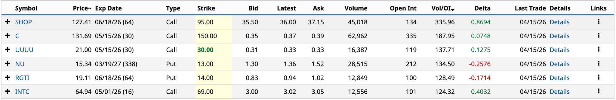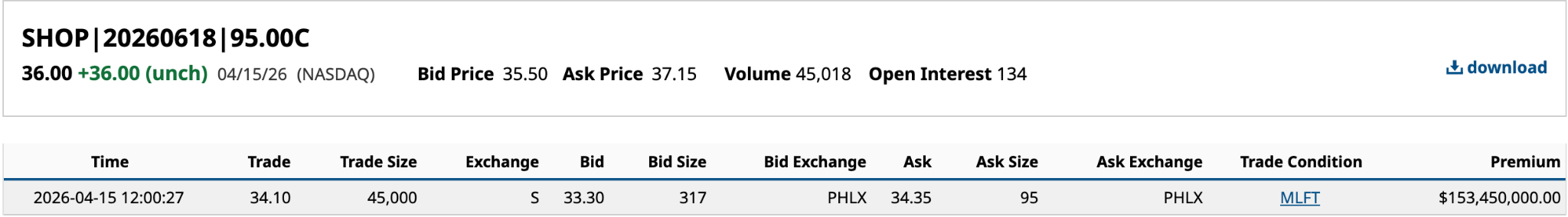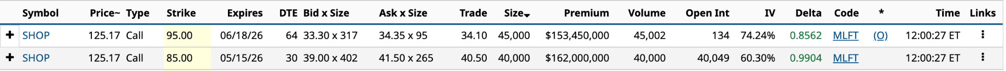 Looking at Shopify’s June 18 $95 call, at first glance, it appears a big fish has taken a very bullish position, going long a whole bunch of $95 calls deep ITM (in-the-money) expiring in a little over two months.