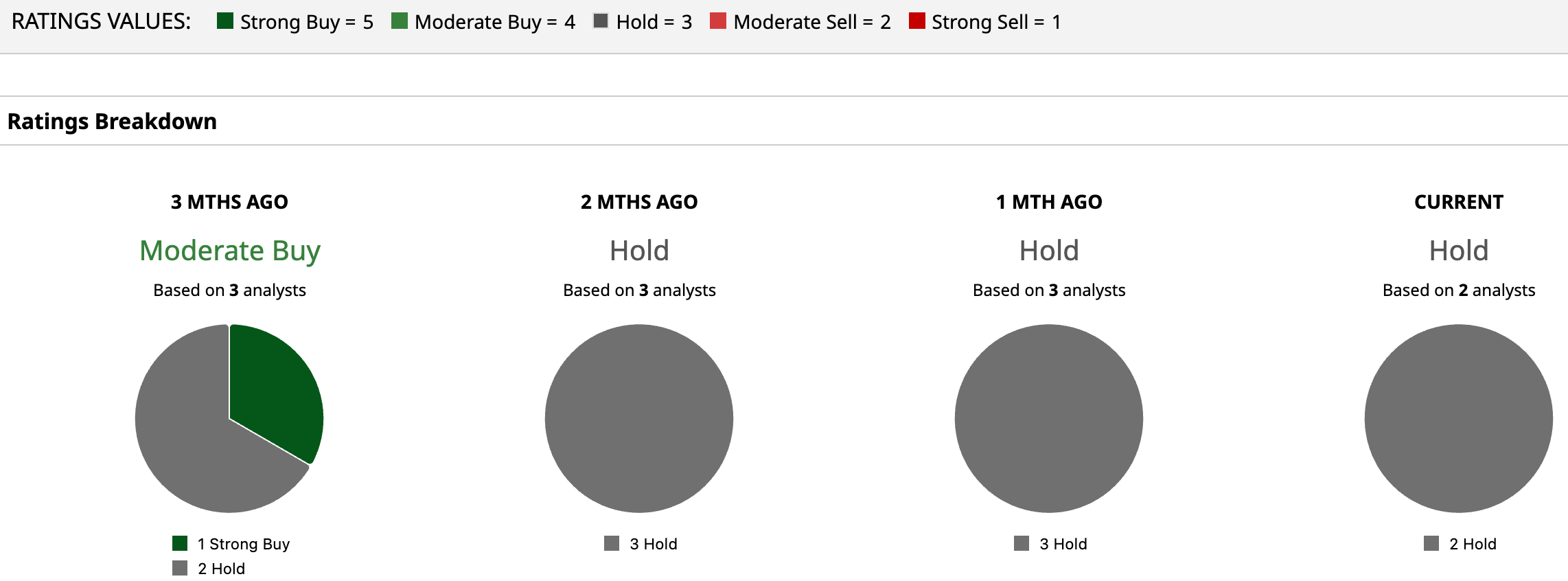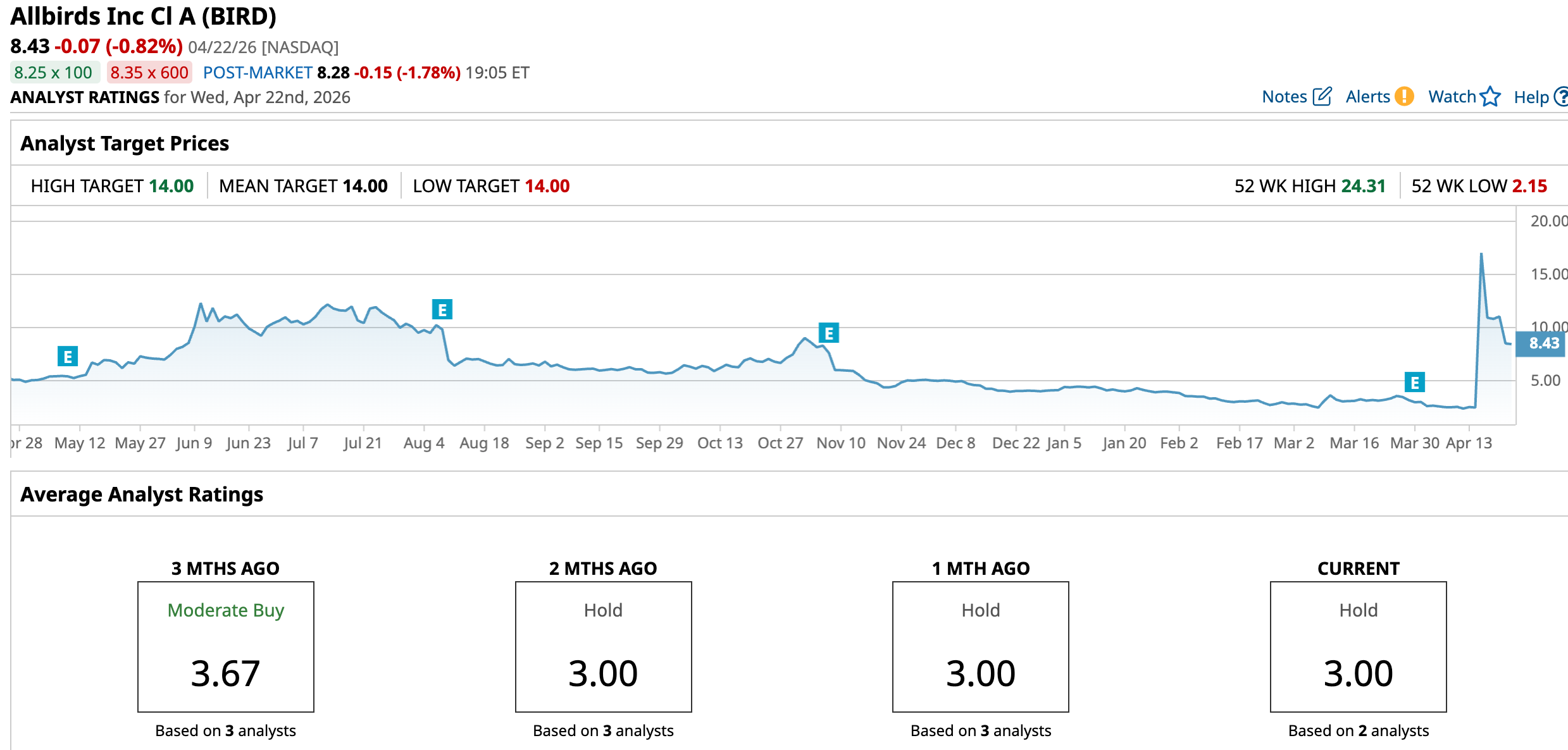 Even with all the recent AI excitement around Allbirds, all of the Street is not exactly jumping in with both feet on the stock. Analysts have quietly dialed back their, with the stock slipping from a “Moderate Buy” rating three months back to a unanimous “Hold” from both analysts covering the stock. That tells us that the AI excitement has not fully translated into confidence.