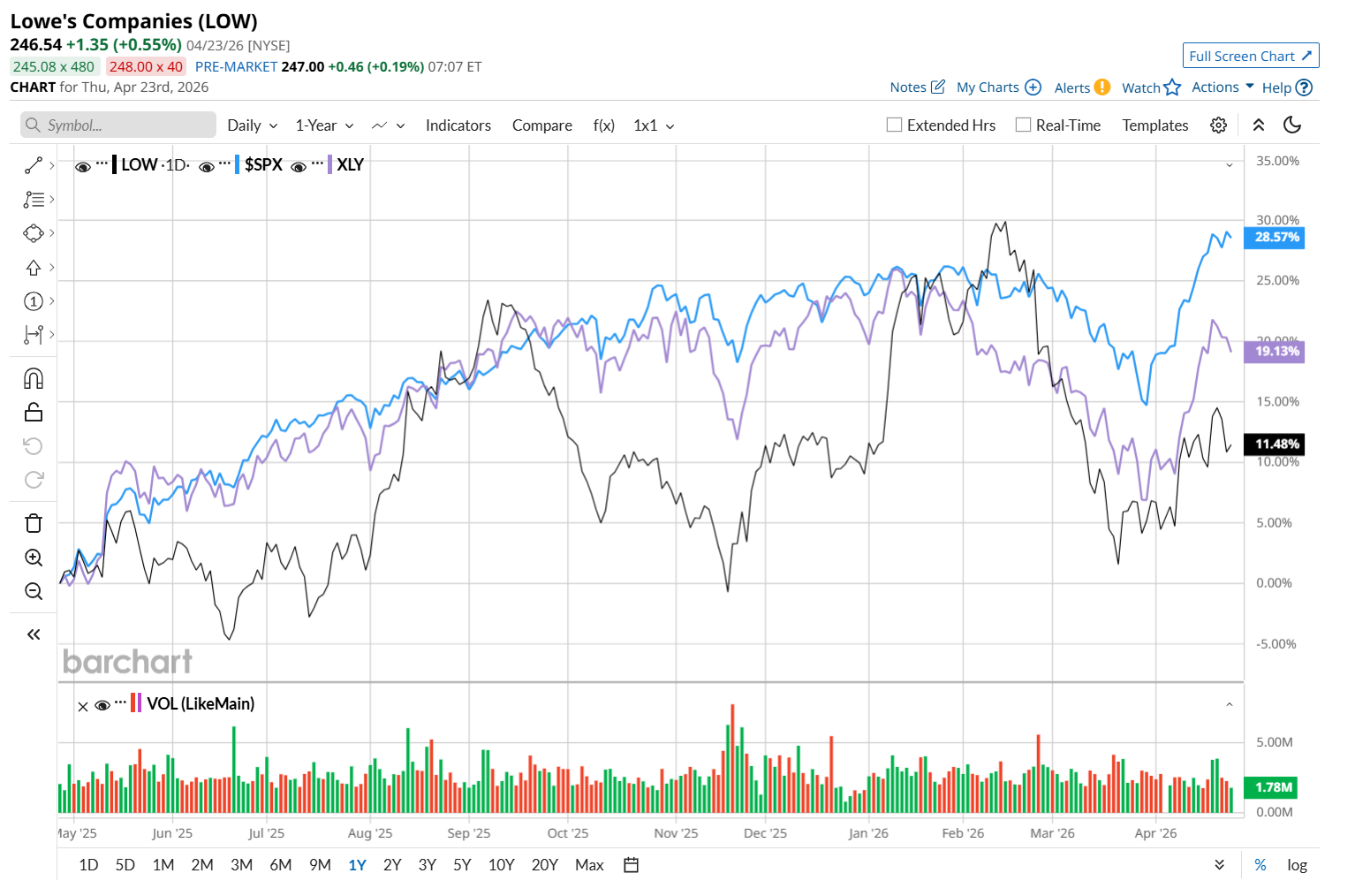 LOW has gained 13.2% over the past 52 weeks, considerably trailing both the S&P 500 Index's ($SPX) 32.2% return and the State Street Consumer Discretionary Select Sector SPDR ETF’s (XLY) 23.7% uptick over the same time period.