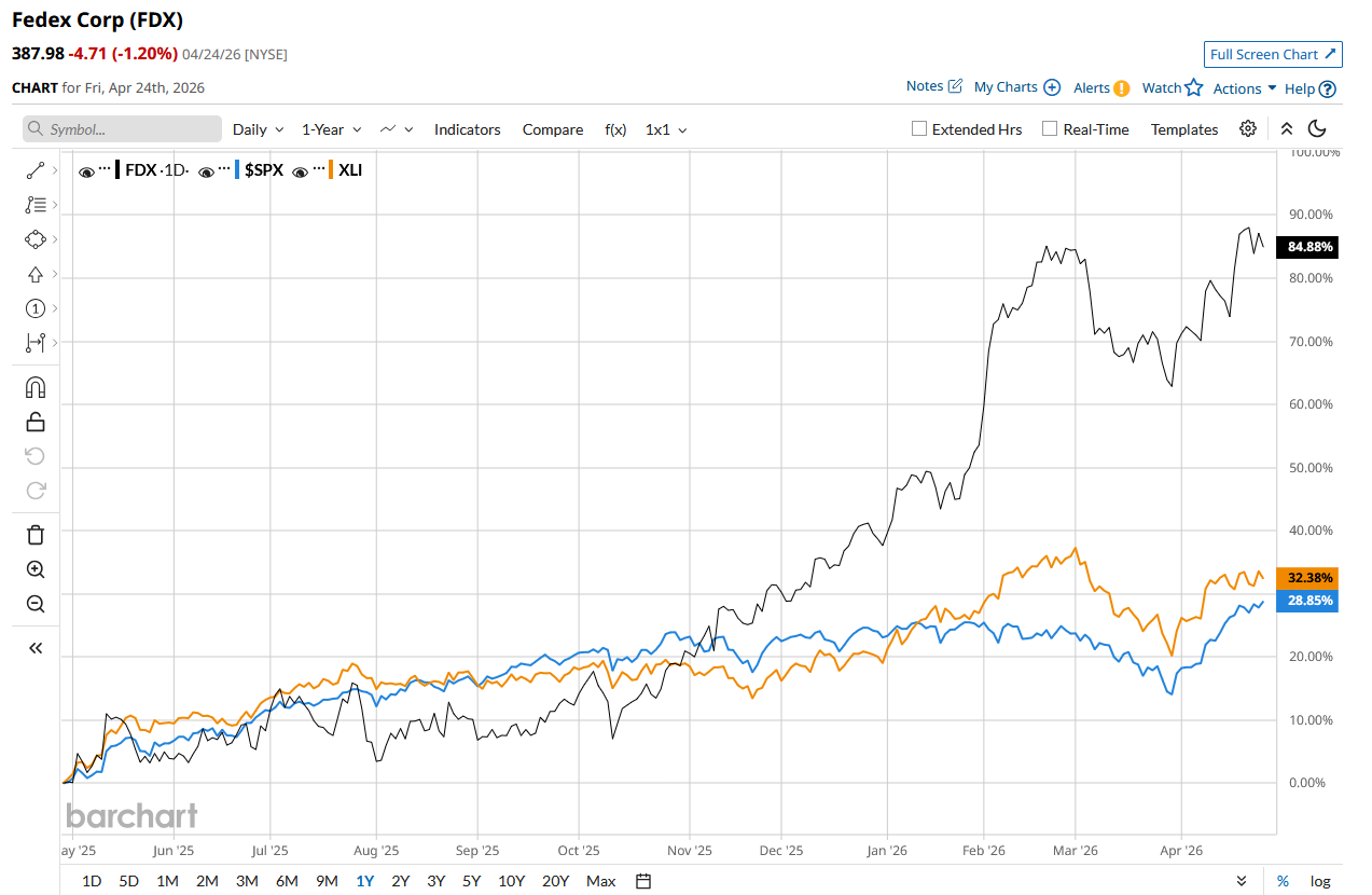 FDX stock has surged 79.9% over the past 52 weeks, outperforming the S&P 500 Index’s ($SPX30.6% rise and the State Street Industrials Select Sector SPDR ETF’s (XLI33.7% return during the same time frame.