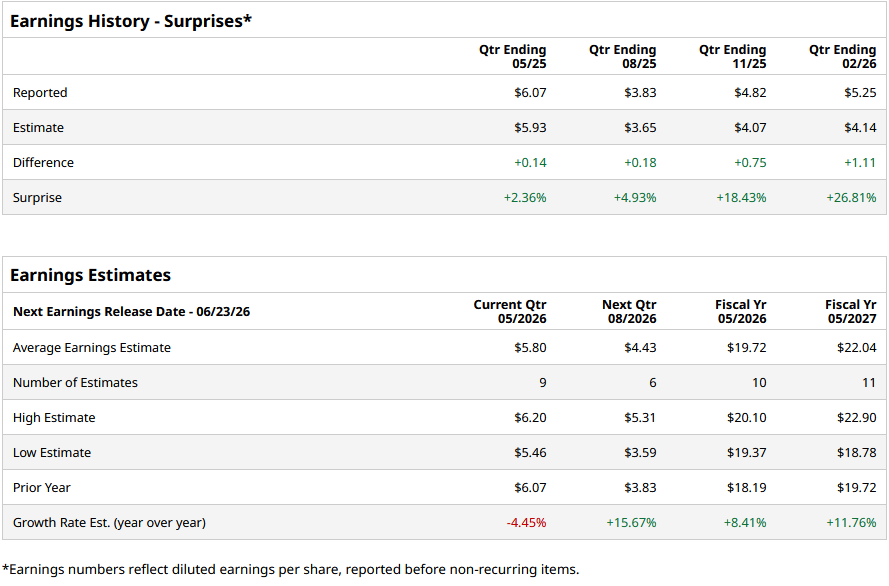 For fiscal 2026, analysts project the company’s EPS to be $19.72, up 8.4% from $18.19 in fiscal 2025. Moreover, its EPS is expected to rise by roughly 11.8% year over year (YoY) to $22.04 in fiscal 2027.
