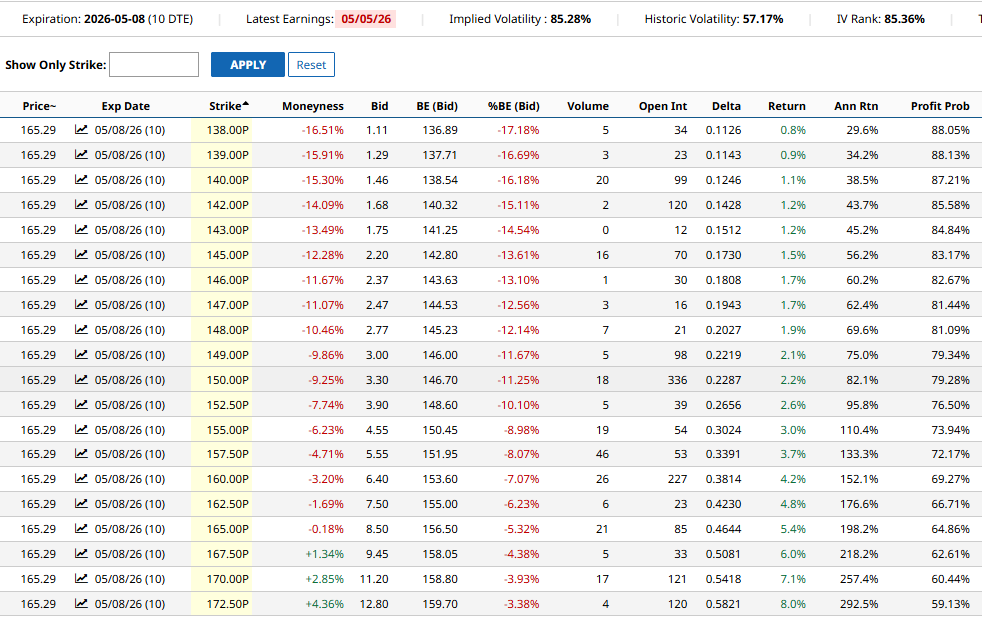 This table shows other potential put selling candidates on Arista Networks for the May 8 expiration.