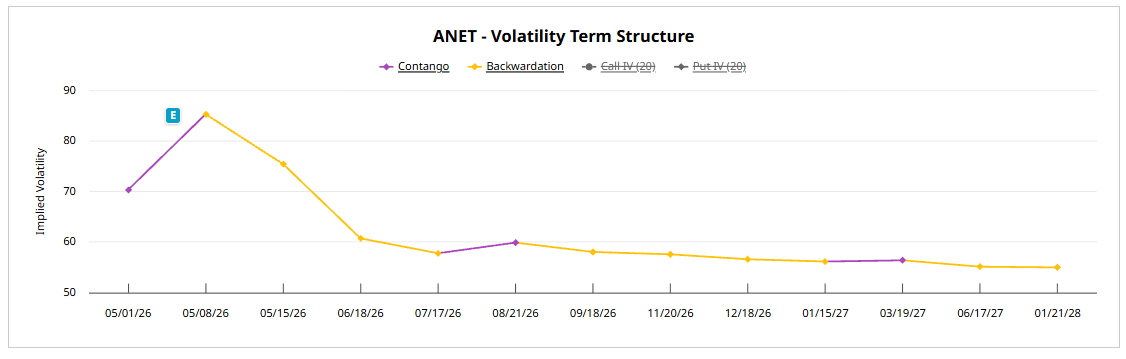 On the Arista Networks volatility charts, we can see the term structure shows that implied volatility is very high for the expiration immediately after earnings.