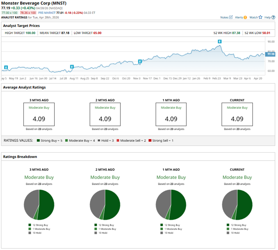 The mean price target of $87.18 represents a 12.9% premium to MNST’s current price levels. The Street-high price target of $100 suggests a 29.6% potential upside.
