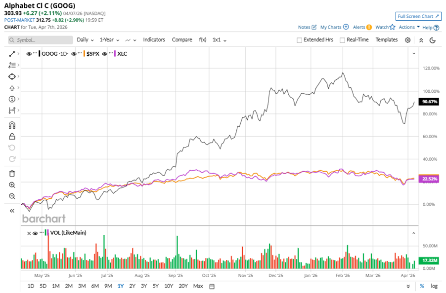 GOOG stock has notably outperformed the S&P 500 Index’s ($SPX) 30.7% gains over the past 52 weeks, with shares up 103.7% during this period. Similarly, it considerably outpaced the State Street Communication Services Select Sector SPDR ETF’s (XLC28% gains over the same time frame.