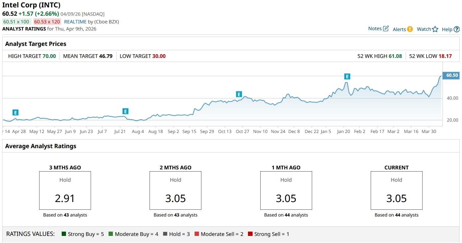 While the consensus rating on INTC stock remains at a “Hold,” analysts’ price targets now go as high as $70, indicating potential upside of another 15% from current levels.