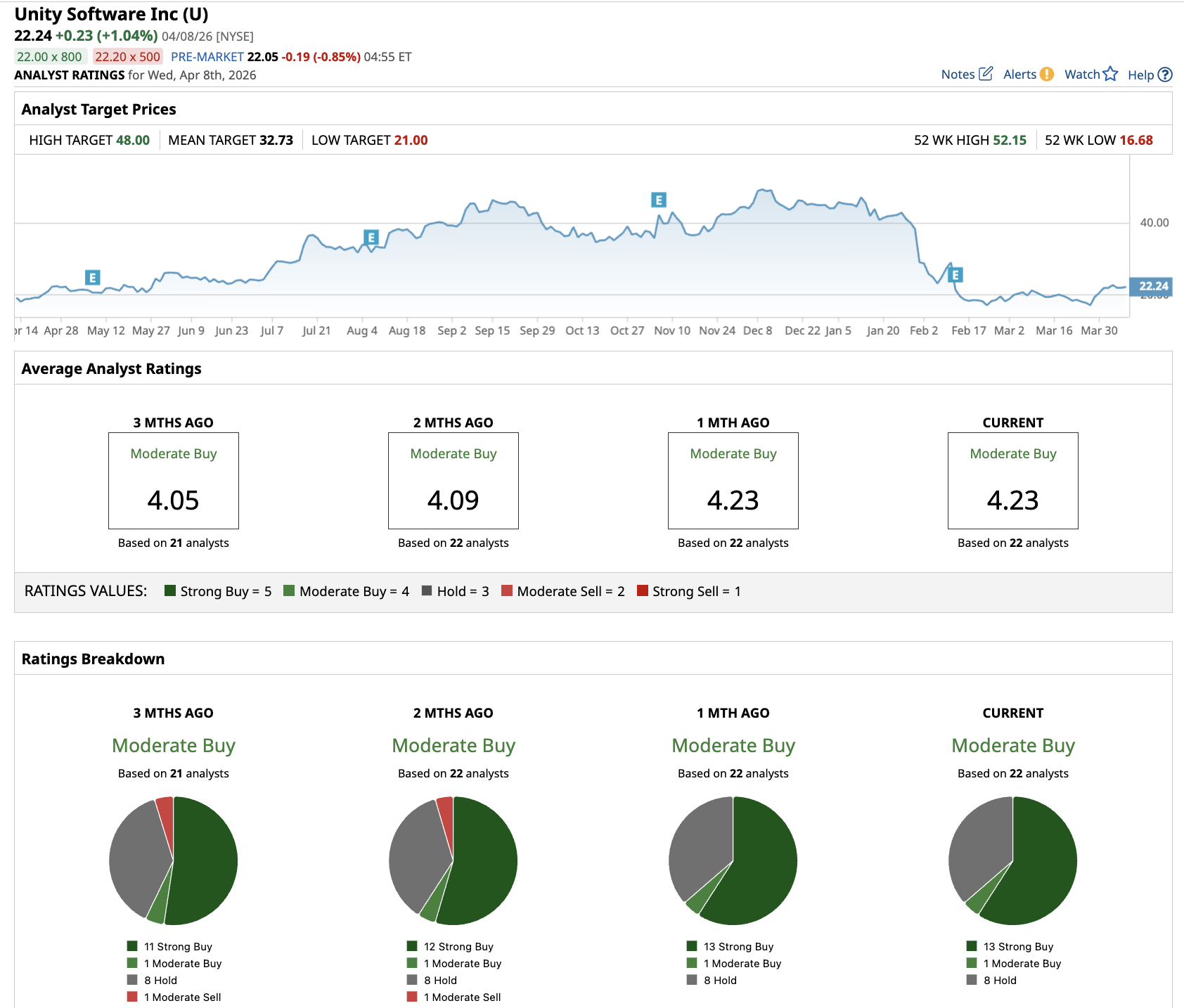 And analysts mostly agree with this outlook. Out of the 22 analysts covering U stock, 13 recommend “Strong Buy,” one recommends “Moderate Buy,” and eight recommend “Hold.” The average U stock price target is $32.73, above the current price of about $22.