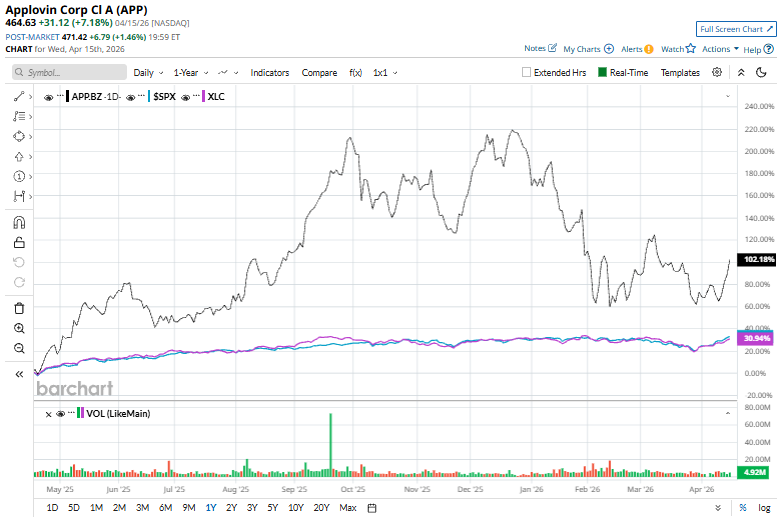 APP shares have gained 89.3% over the past year, significantly outperforming the S&P 500 Index’s ($SPX30.1% gains and the Communication Services Select Sector SPDR ETF’s (XLC27.4% uptick over the same time frame.