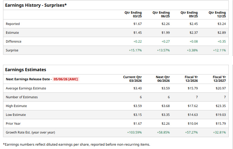 The advertising giant is expected to announce its fiscal first-quarter earnings for 2026 after the market closes on Wednesday, May 6. Ahead of the event, analysts expect APP to report a profit of $3.40 per share on a diluted basis, up 103.6% from $1.67 per share in the year-ago quarter. The company has consistently surpassed Wall Street’s EPS estimates in its last four quarterly reports.