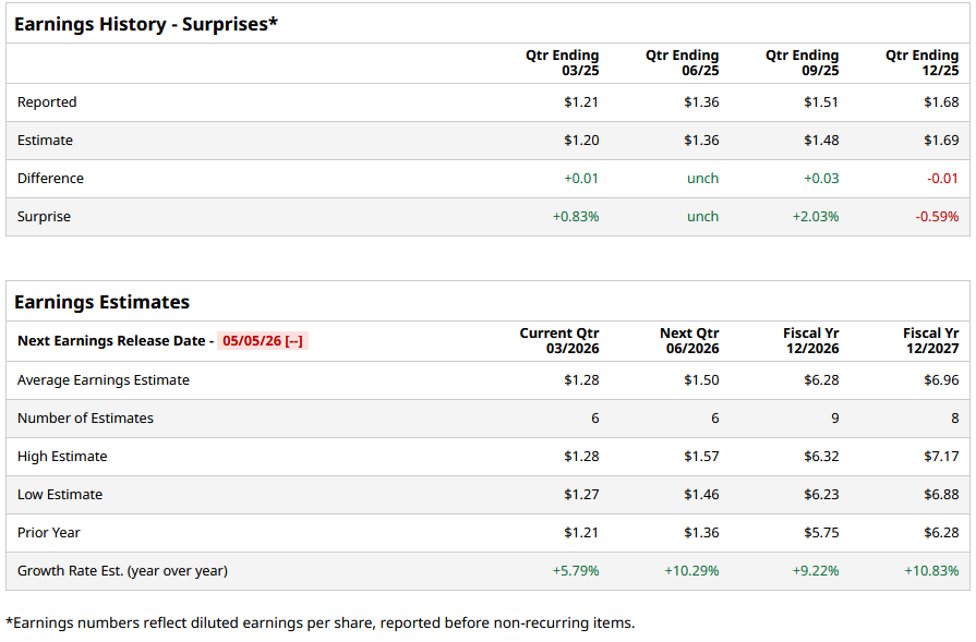 For fiscal 2026, analysts project the company’s EPS to be $6.28, up 9.2% from $5.75 in fiscal 2025. Moreover, its EPS is expected to rise by roughly 10.8% year over year (YoY) to $6.96 in fiscal 2027.
