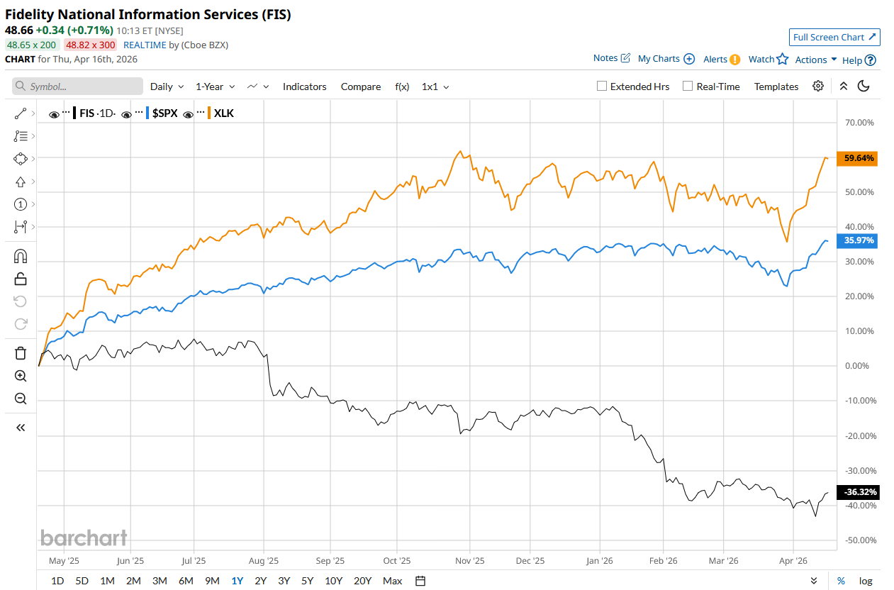 FIS stock has declined 28.9% over the past 52 weeks, underperforming the S&P 500 Index’s ($SPX33.2% rise and the State Street Technology Select Sector SPDR ETF’s (XLK55.5% rise during the same time frame.
