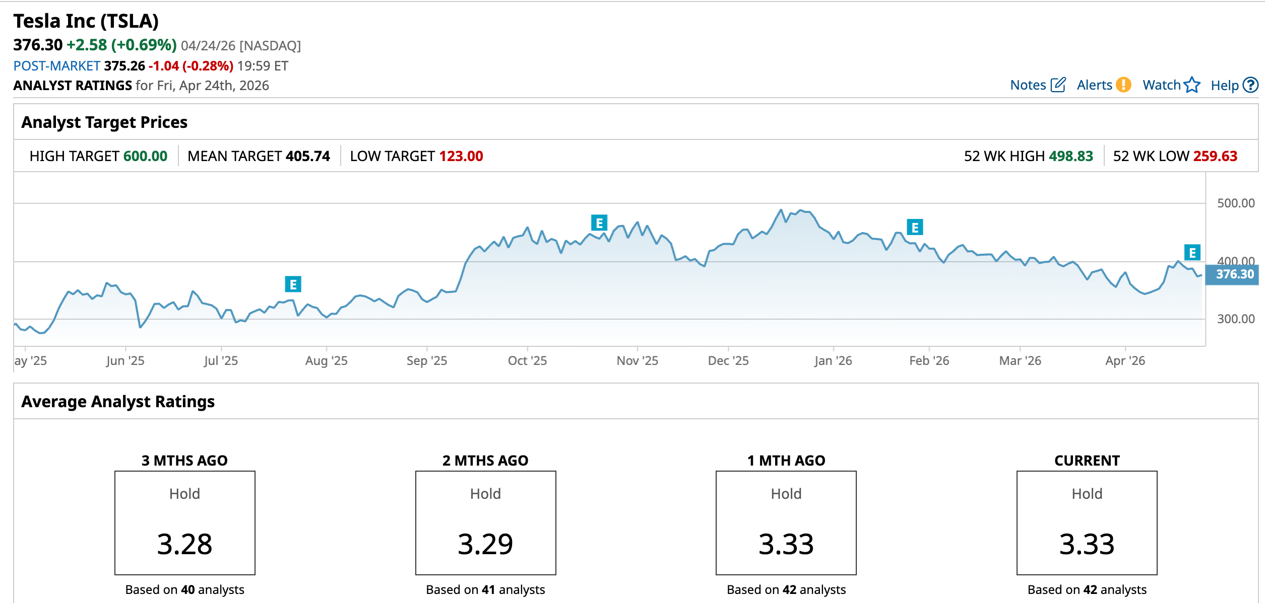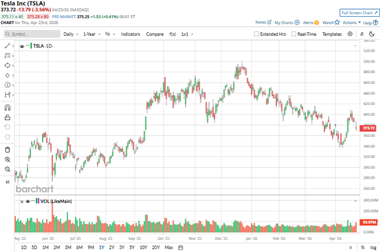 While the stock is up 45% over the past 52 weeks, it is not seen as enough by the standards Tesla set for itself earlier. Tesla’s stock has been down this year, mainly because investors are worried about margin pressure, weak demand in some markets, and a high valuation that has priced in a lot of future optimism. Recent delivery numbers have also disappointed. This year, Tesla’s stock has been down 16.9%. It had last posted a 52-week high of $498.83 in December 2025, and is down 24.6% from that level.