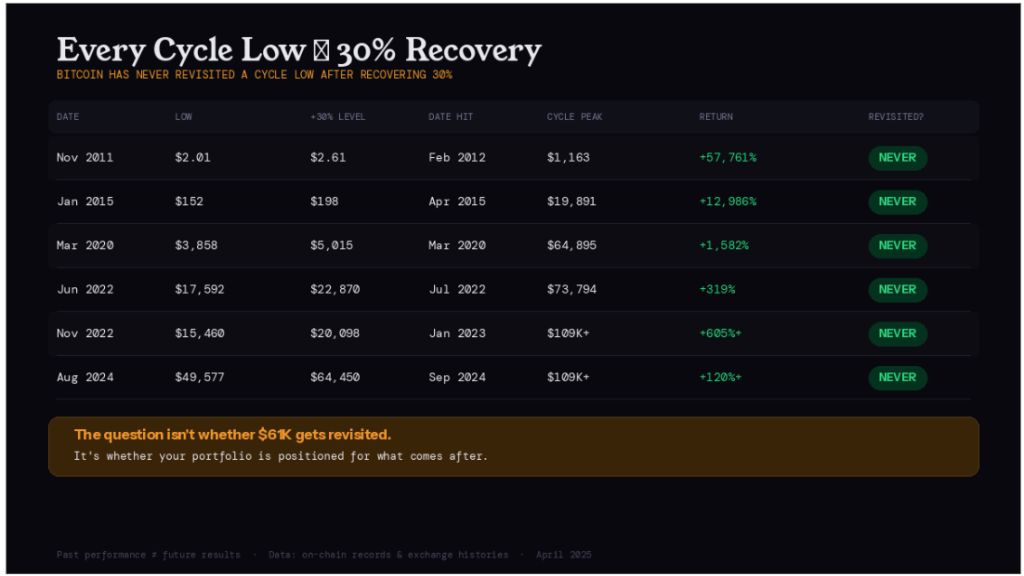 A dataset highlighted by market participant Isaiah Douglass has brought attention to Bitcoin’s recovery after this low. The claim is that once Bitcoin recovers 30% from a cycle low, it has never gone back to retest that low.