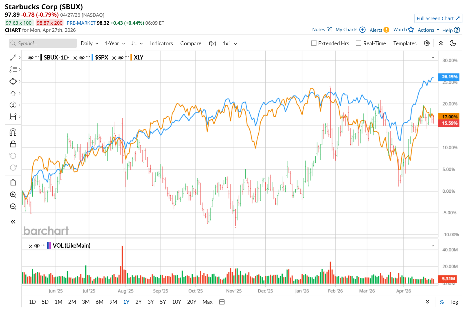 Narrowing the focus, SBUX has also lagged the State Street Consumer Discretionary Select Sector SPDR ETF’s (XLY19.3% uptick over the past 52 weeks. Nonetheless, it has notably outperformed XLY’s 1.3% YTD drop.