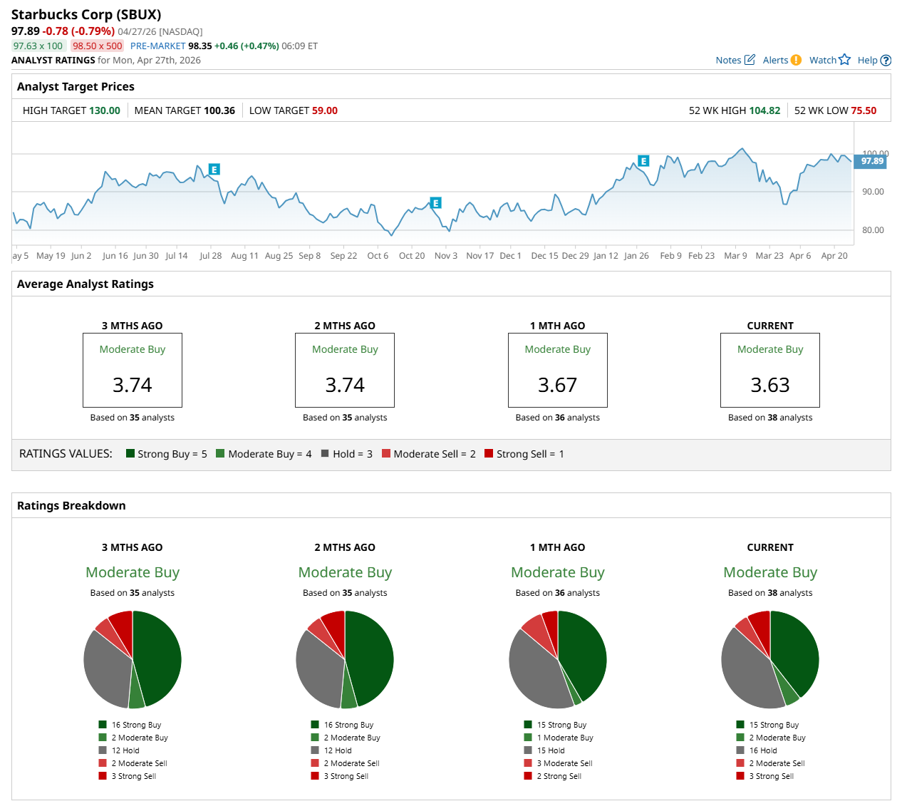 On Apr. 24, Bank of America Corporation (BAC) analyst Sara Senatore maintained a “Buy” on SBUX and raised its price target to $130, the Street-high price target, indicating a 32.8% potential upside from the current levels.