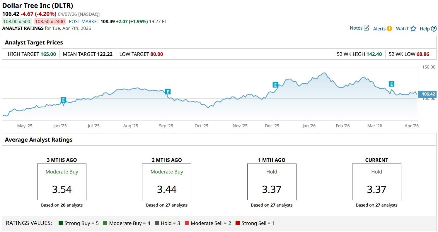 According to Barchart, the consensus rating on DLTR stock sits at “Hold” only — though the mean target of $122 signals potential upside of more than 15% from here.