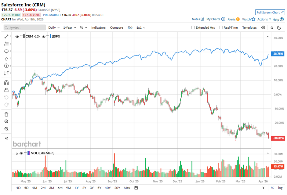 Shares of this software heavyweight have been under intense pressure as AI fears rattle sentiment. The stock has tumbled 36.74% over the past year and plunged another 36.68% in 2026, sharply underperforming the broader S&P 500 Index ($SPX), which surged 25% last year and is only marginally lower this year.