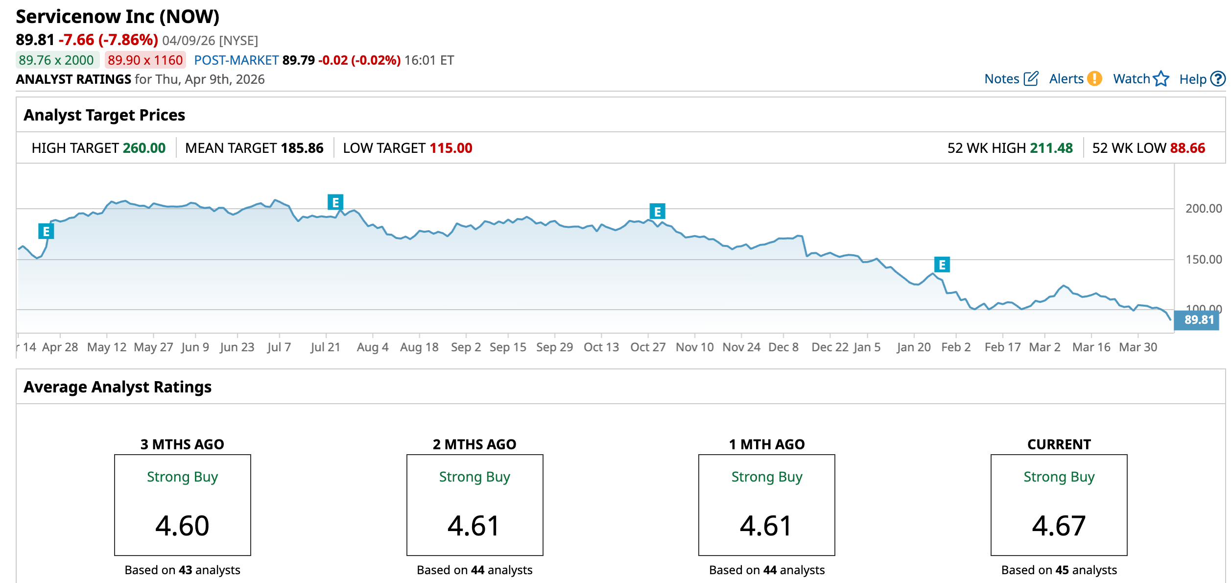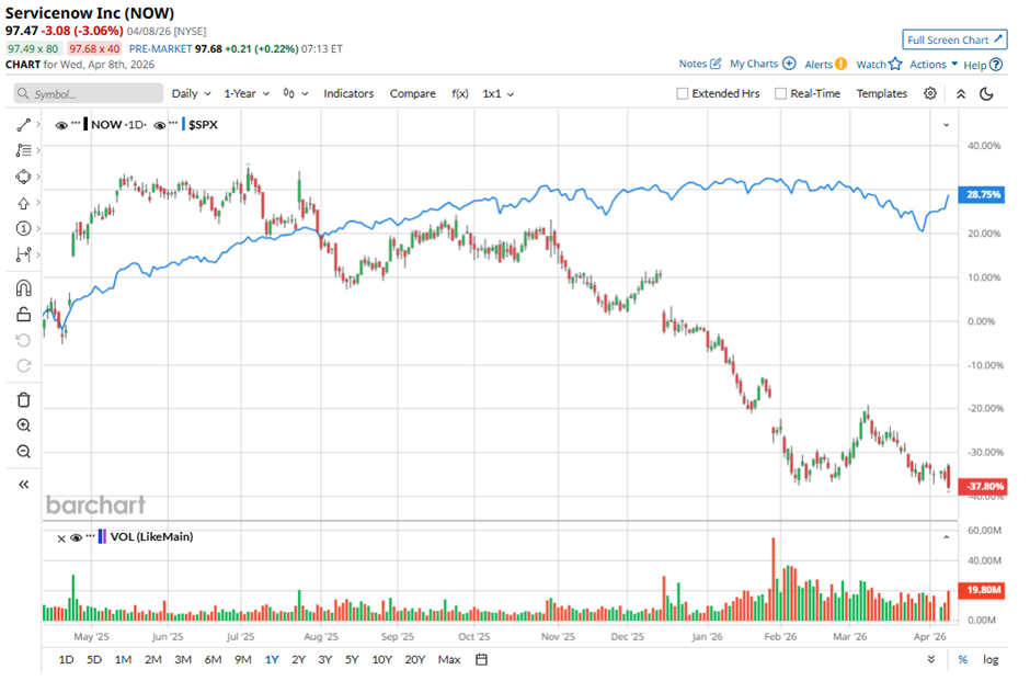 Currently valued at a market capitalization of around $101.9 billion, ServiceNow has fallen out of favor on Wall Street, mirroring the broader weakness in software stocks. Shares have dropped nearly 46% over the past year, and the sell-off has only intensified in 2026, with the stock down about 36.4% year-to-date (YTD), significantly lagging the broader market across both periods.