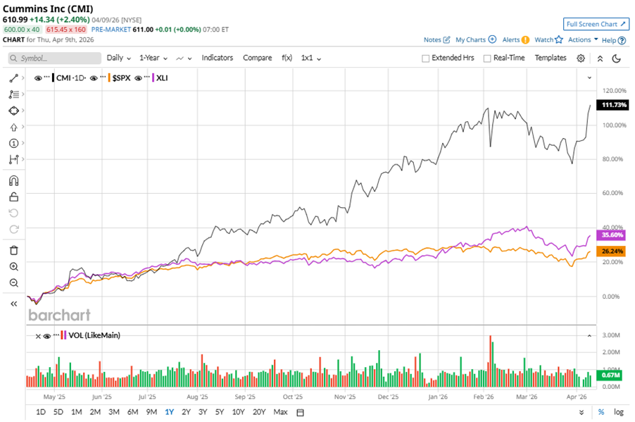 CMI stock has considerably outperformed the S&P 500 Index’s ($SPX) 25.1% gains over the past 52 weeks, with shares up 106% during this period. Similarly, it notably outperformed the State Street Industrial Select Sector SPDR ETF’s (XLI) 35.8% gains over the same time frame.