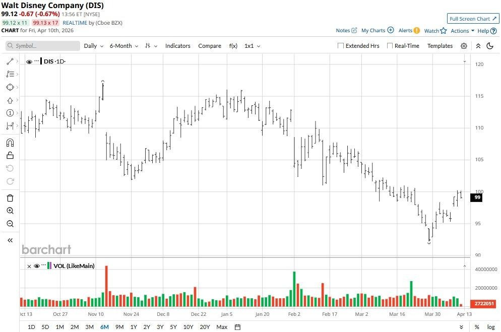 Disney stock has been in a downtrend since the start of 2026, currently trading at about a 15% discount to its year-to-date high.