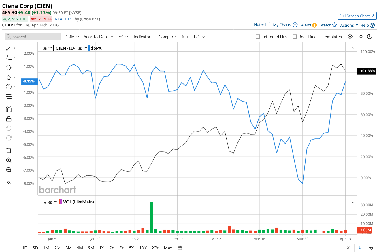Ciena Corporation (CIEN) is not a pure-play artificial intelligence (AI) company like Nvidia (NVDA), yet without it, AI at a global scale just won’t work. This is precisely why investors are starting to pay attention. Ciena's shares have climbed 108% year-to-date (YTD) and 733% over the past 52 weeks, outperforming the top AI stocks and the overall market.