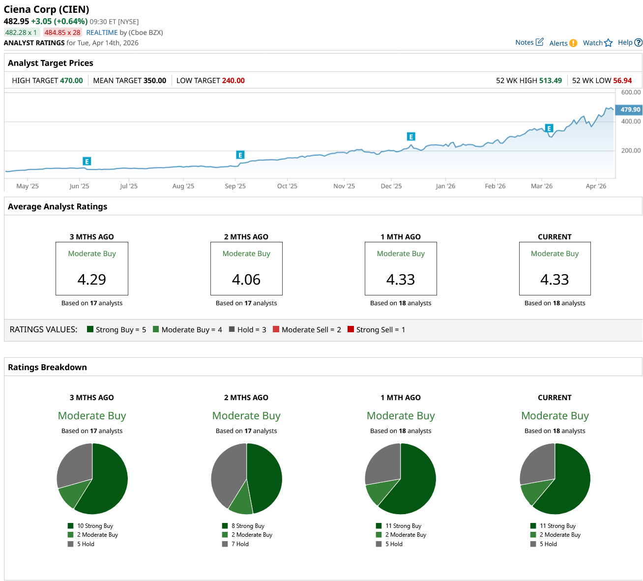 Overall, Wall Street rates CIEN stock a “Moderate Buy.” Of the 18 analysts covering the stock, 11 rate it a “Strong Buy,” two rate it a “Moderate Buy,” and five rate it a “Hold.” The stock has surpassed both its average target price and high price target.