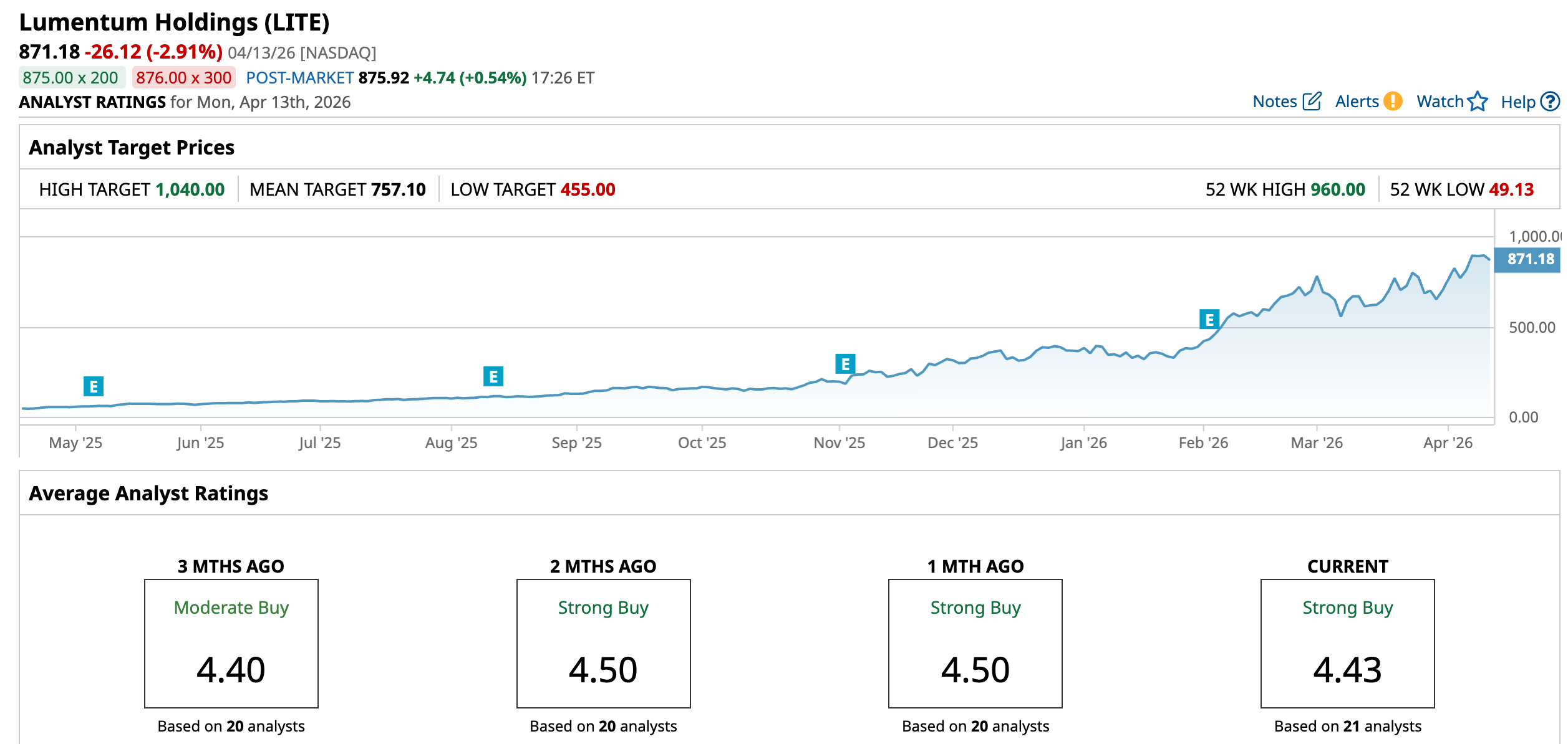 After its impressive run, LITE now trades above its average Street target. Yet the Street-high $1,040 call still flags roughly 19.38% upside potential from here.
