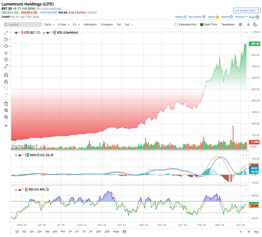Technically, the setup for LITE still looks firmly in the bulls’ favor. The 14-day RSI, which had risen to overbought territory in February, has now cooled to 61.76, suggesting the stock has reset without losing its underlying strength.