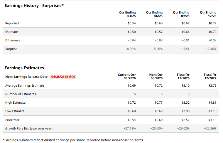 The Corning, New York-based company is set to announce its fiscal Q1 2026 results before the market opens on Tuesday, Apr. 28. Ahead of the release, analysts expect GLW to report adjusted EPS of $0.69, a 27.8% increase from the $0.54 in the year-ago quarter. It has exceeded Wall Street's earnings expectations in the past four quarters.