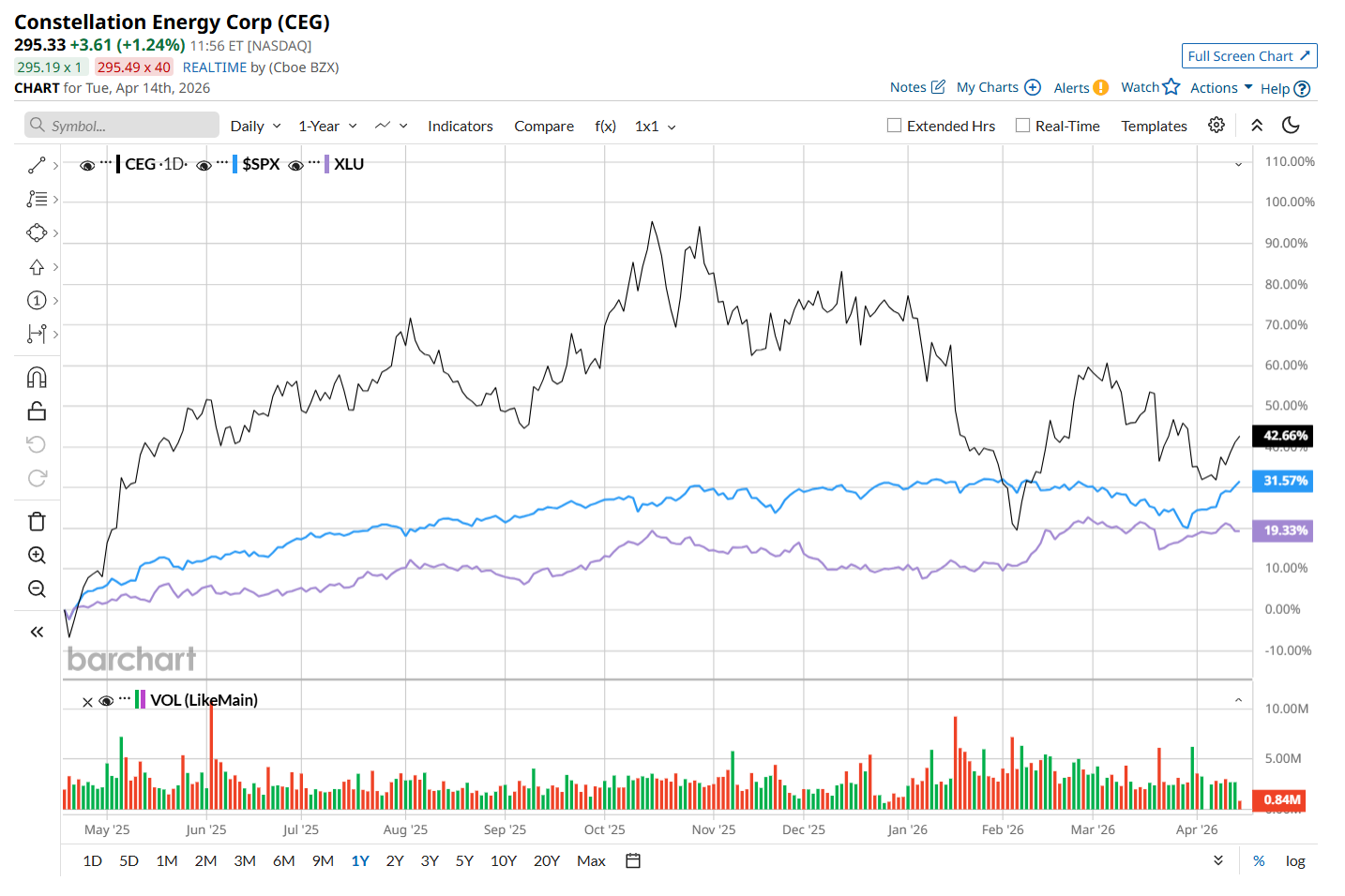 CEG has rallied 42.6% over the past 52 weeks, considerably outperforming both the S&P 500 Index's ($SPX28.4% return and the State Street Utilities Select Sector SPDR ETF’s (XLU19.5% uptick over the same time period.