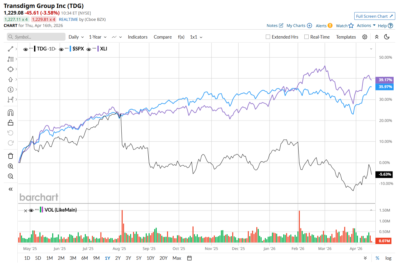 TDG has declined 5.8% over the past 52 weeks, considerably underperforming both the S&P 500 Index's ($SPX30.1% return and the State Street Industrial Select Sector SPDR ETF’s (XLI37.4% uptick over the same time period.