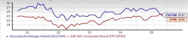 On the basis of trailing 12-month price-to-earnings (P/E), which is commonly used for valuing exchange stocks, the industry is currently trading at 23.31X compared with the S&P 500’s 22.6X and the sector’s 17.5X.