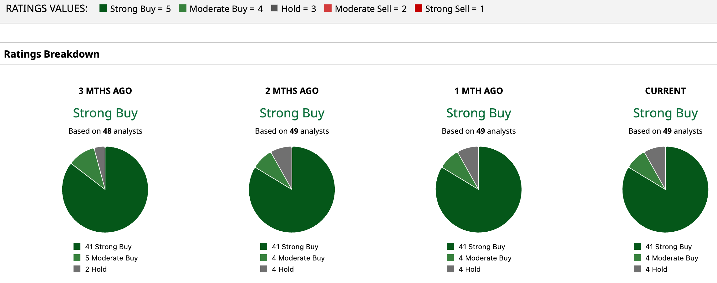 Overall, analysts are upbeat about the chip giant’s growth potential, giving the stock a consensus rating of “Strong Buy.” Of the 49 analysts covering the stock, 44 advise a “Strong Buy,” three suggest “Moderate Buy,” one recommends a “Hold,” and the remaining one has a “Strong Sell.”