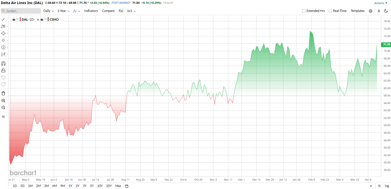Delta ranks as a top-rated stock in the S&P 500 Industrials, and after the company’s solid first-quarter results, DAL stock has started to look more like a pullback than a breakdown. Shares have rallied 72% over the past year, yet have risen less than 1% year-to-date (YTD). Technically, DAL stock is hovering near its 50-day moving average and well above its 200-day line, which suggests the recent weakness may be more about sector-wide fuel fears than a real deterioration in the underlying business.