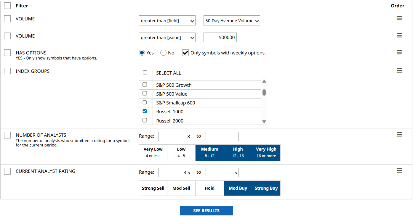 Here, I screened for optionable stocks and drilled down further to include only those with weekly options, which narrows our list to the most popular names among options traders.