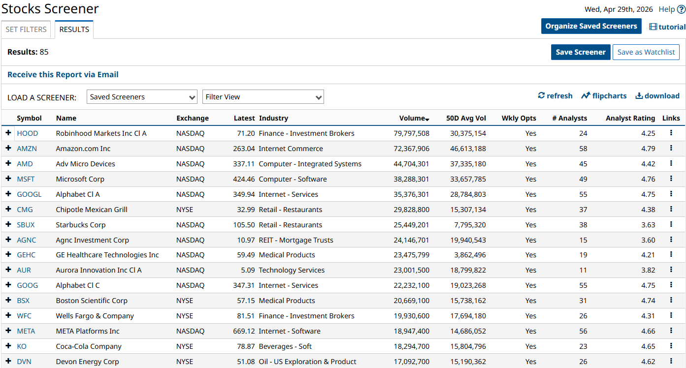 When I ran this extremely basic stock screener after the close on Wednesday, April 29, it gave me 85 results — not too bad for such quick work.
