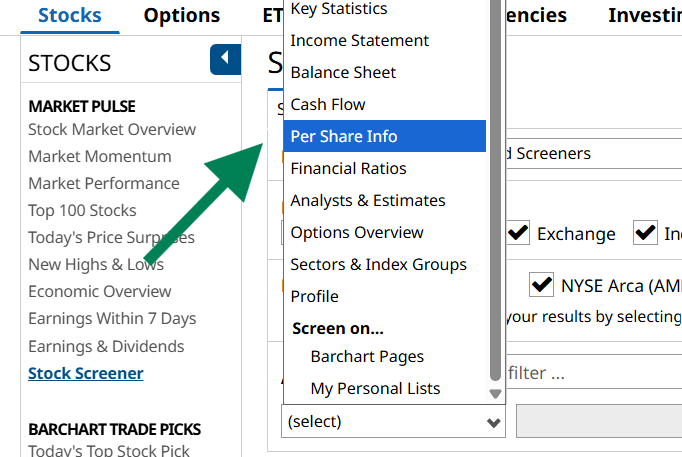 Over on the investing side, you can refine your search further than I did here by adding filters for dividend payouts, earnings and revenue growth, and any other fundamental data you want to include on the list. On our free Stock Screener, be sure to check the drop-down Filter menu for Financial Ratios, Balance Sheet, and Per Share Info to find all of your go-to metrics.
