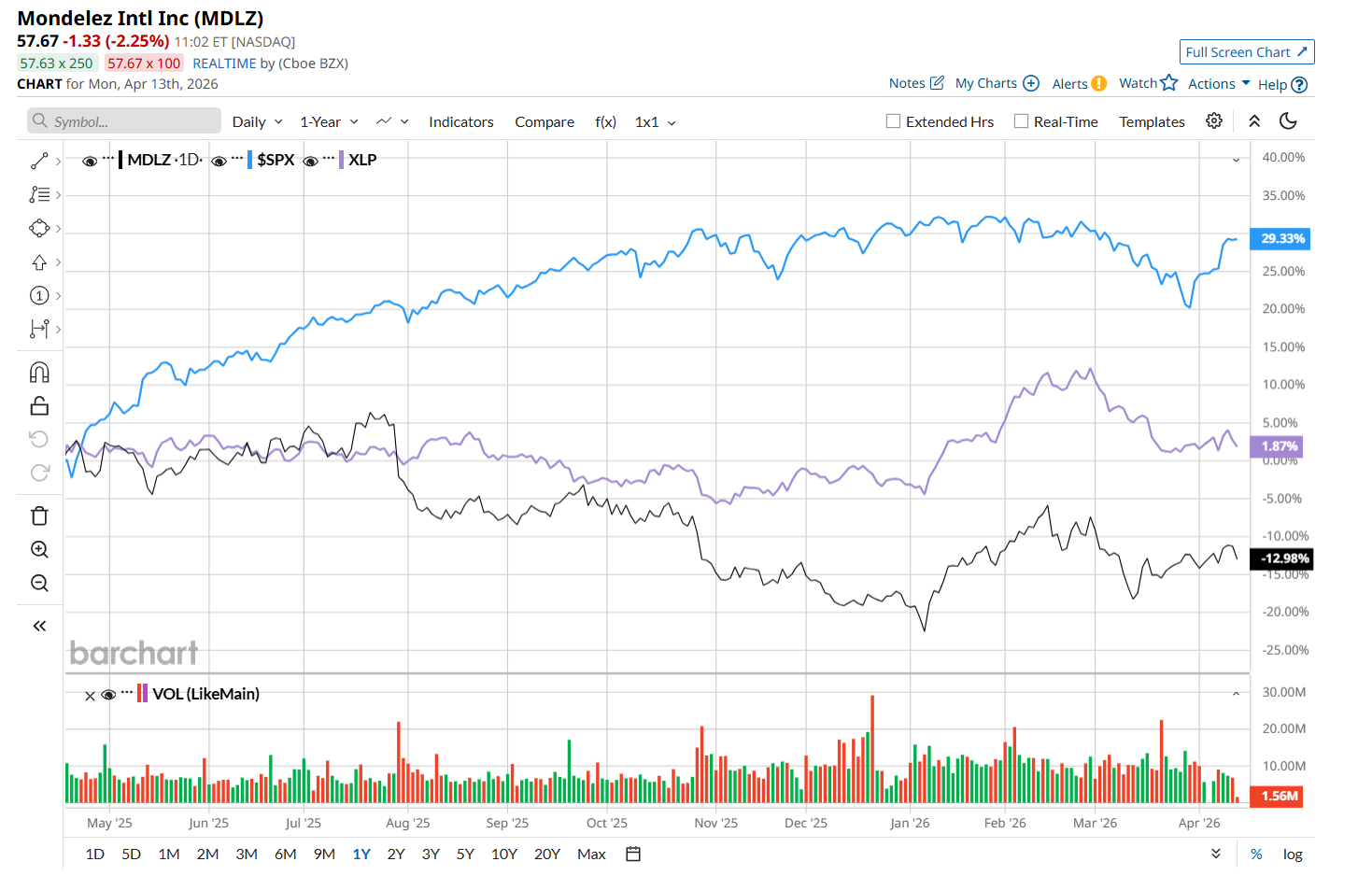 MDLZ has declined 13.6% over the past 52 weeks, considerably underperforming both the S&P 500 Index's ($SPX) 29.4% return and the State Street Consumer Staples Select Sector SPDR ETF’s (XLP) 1.6% uptick over the same time period.