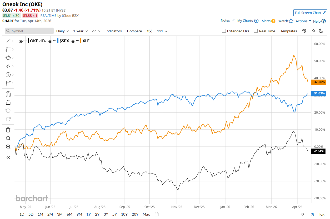 OKE stock has surged marginally over the past 52 weeks, underperforming the S&P 500 Index’s ($SPX) 28.1% rise, and the State Street Energy Select Sector SPDR ETF’s (XLE) 43.3% return during the same time frame.