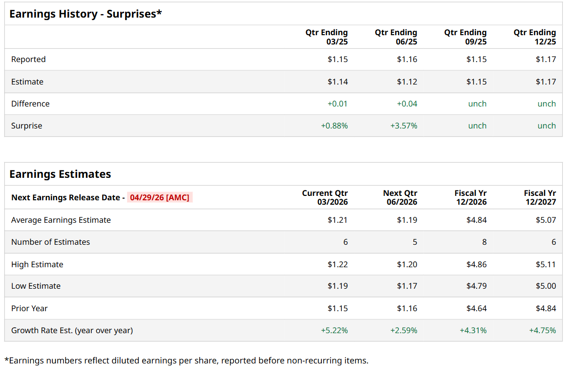 Ahead of this event, analysts expect this REIT to report an FFO of $1.21 per share, up 5.2% from $1.15 per share in the year-ago quarter. The company has met or topped Wall Street’s FFO estimates in each of the last four quarters. In Q4 2025, REG’s FFO of $1.17 met the consensus expectations.