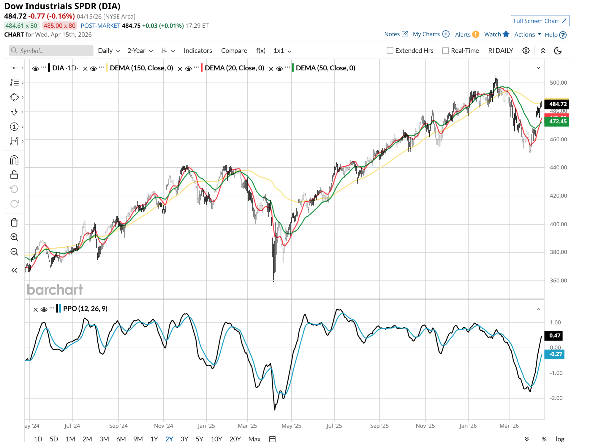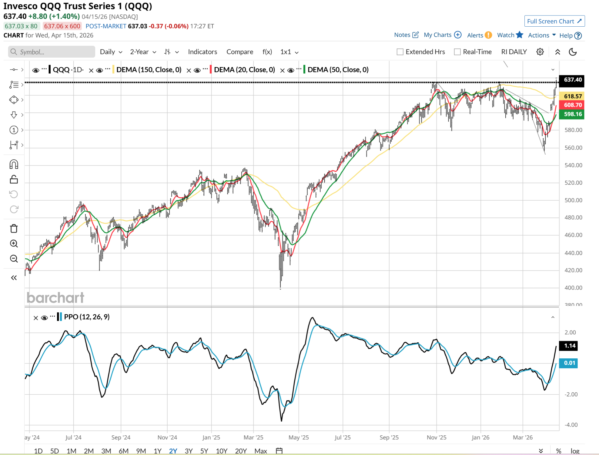 Here’s QQQ. Triple top, anyone? Yet this was as of Wednesday’s market close. By the time this is published and you read it, we could be half a world away. And that’s despite our crew here at Barchart having the fastest turnaround time I’ve seen in decades of writing. That’s how chaotic the stock market is in this War-infused period.