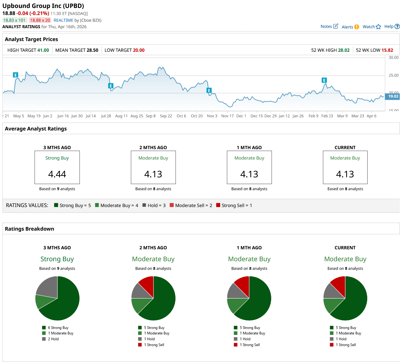 Overall, Wall Street says UPBD stock is a “Moderate Buy.” Of the eight analysts covering the stock, five rate it a “Strong Buy,” one rates it as a “Moderate Buy,” one says it is a “Hold,” and one recommends a “Strong Sell.”