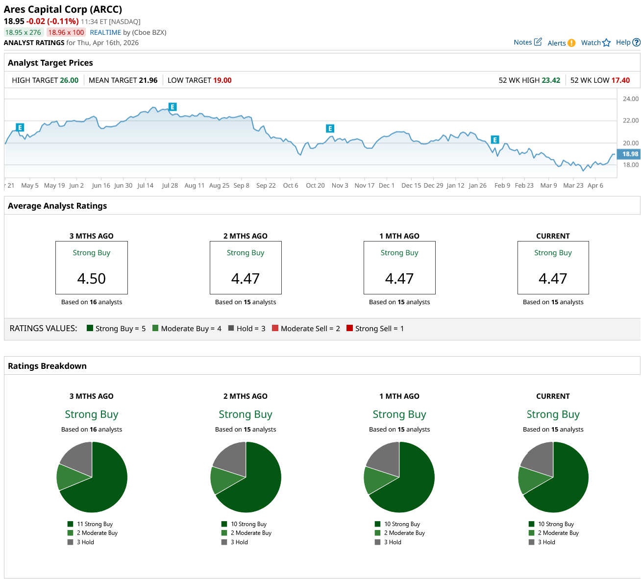 Overall, Wall Street says ARCC stock is a “Strong Buy.” Of the 15 analysts covering the stock, 10 rate it a “Strong Buy,” two rate it as a “Moderate Buy,” and three rate it a “Hold.”