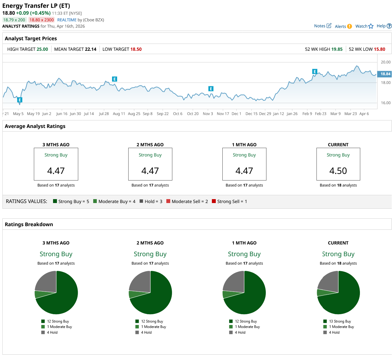 Overall, Wall Street says ET stock is a “Strong Buy.” Of the 18 analysts covering the stock, 13 rate it a “Strong Buy,” one rates it as a “Moderate Buy,” and four say it is a “Hold.”