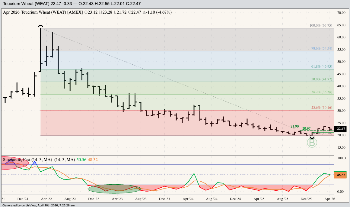 Which is why I’ve set aside my Goldilocks Principle (Daily charts are too hot, monthly charts are too cold, but weekly charts are just right), particularly with the wheat sub-sector, and focused my investment attention on a long-term Exchange Traded Fund (ETF) position. A look at the monthly chart for Teucrium (WEAT) and we see the ETF completed a bullish key reversal this past January confirming a move to major (long-term) uptrend. Theoretically, investors might’ve bought near the January settlement of $20.97, with WEAT closing this past March (2026) at $23.57, a gain of roughly 12.4%. Not bad for a couple months’ time and avoiding the headaches that come with holding futures and/or cash positions.