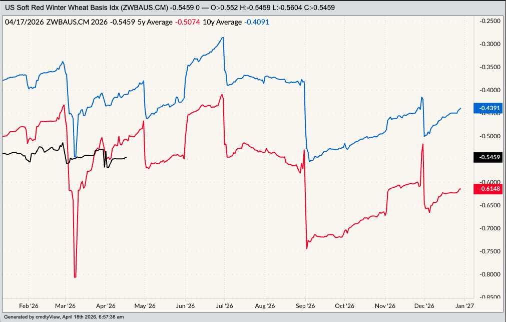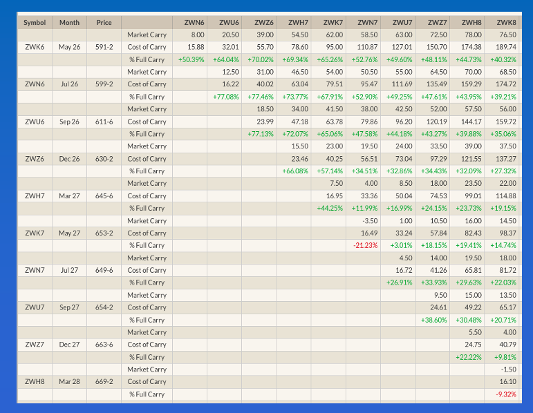 Do market fundamentals support this long-term investment position? No, but as we see in so many other markets, fundamentals don’t seem to matter all that much these days. (Goodbye Market Rule #6: Fundamentals win in the end. You were useful for decades.) Keep in mind the WEAT ETF is based on SRW futures, so we need to switch gears a bit from our earlier look at HRW futures. Fundamentally, SRW is a conundrum (a problem admitting of no satisfactory solution). New-crop July-September and September-December futures spreads, as well as the July-May 2026 forward curve are covering a bearish level of calculated full commercial carry beyond 70%. But this comes with an asterisk given carry is being calculated using the CME’s lower Variable Storage Rate of 16.5/100s of one cent per bushel per day (approximately 5 cents per bushel per month) as compared to the higher rate of 26.5/100s of one cent per bushel per day (approximately 8 cents per bushel per month) still used in HRW.